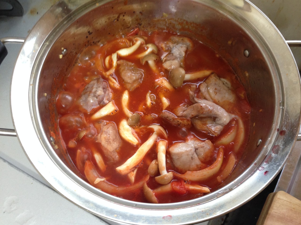 8.鶏肉と冷凍したシメジを鍋に加えて15分ほど煮込む。
