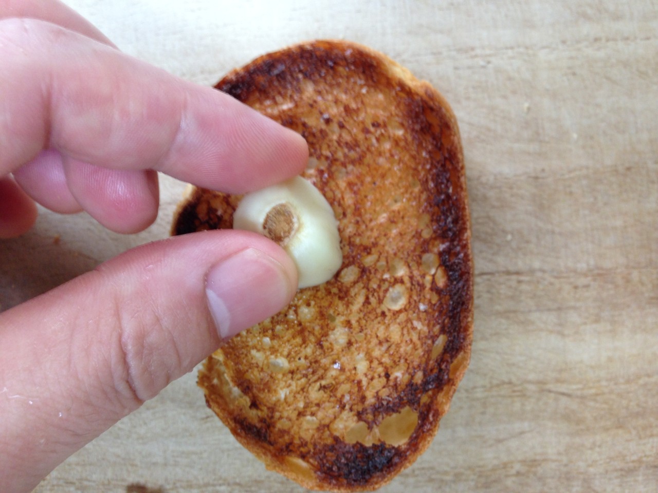 5.トースターで焼いたフランスパンに、4ですりおろして半分になったニンニクをすりこむ。