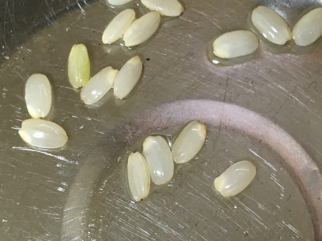 玄米の様子を拡大して見てみると、十分に水を吸って芽の部分が少し膨らんでいます。この状態で、十分に発芽状態になっているとのこと。