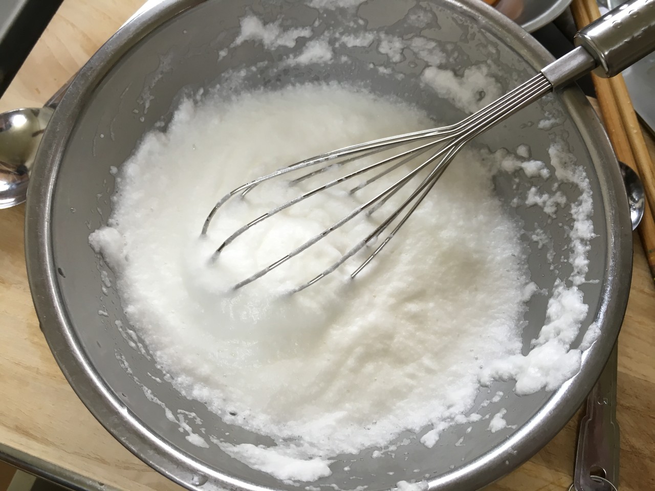 卵は卵白と卵黄に分けて、卵白を泡だて器でメレンゲ状にする。こうすることで過熱するとふわふわの状態になる。