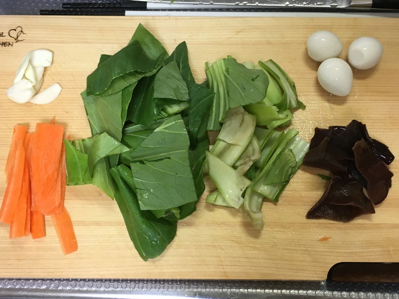 3.ニンニクは芽を取り除いて薄切り、人参、青梗菜は薄く刻み、水で戻したきくらげを一口大きさに切り分ける。