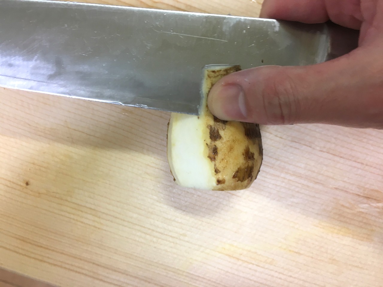 3.次に、縦に包丁を入れて皮をむく。